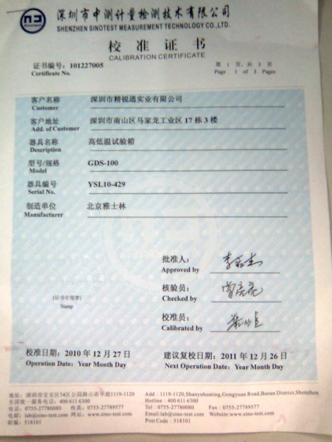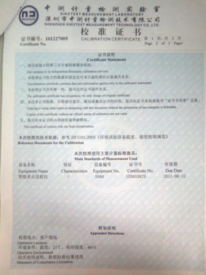 高低溫濕熱試驗(yàn)箱校準(zhǔn)證書-深圳中測(cè)計(jì)量-深圳精銳通
