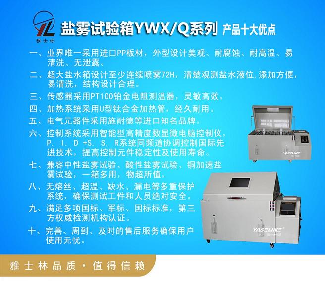 鹽霧腐蝕試驗箱為人工氣候環(huán)境“三防”(濕熱、鹽霧、霉菌)試驗設備之一,是模擬大氣中含鹽微小液滴所構(gòu)成的彌散系統(tǒng)的設備。廣泛應用在電子、電工及汽車、摩托車、五金工具、化工等產(chǎn)品及零部件、金屬材料與制品的鍍、涂層等進行鹽霧試驗。市場規(guī)模巨大,競爭空前,雅士林YASELINE系列鹽霧試驗箱高起點、高質(zhì)量、高服務,定位于中高端客戶群體,以其過硬的質(zhì)量和完善的售后服務及良好的市場口碑贏得了中國航天、中國科學院、清華大學、北航、摩托羅拉、ABB、西門子、豐田汽車、中國船舶、北京現(xiàn)代汽車等一系列高端客戶群,其產(chǎn)品具有如下十大優(yōu)點: